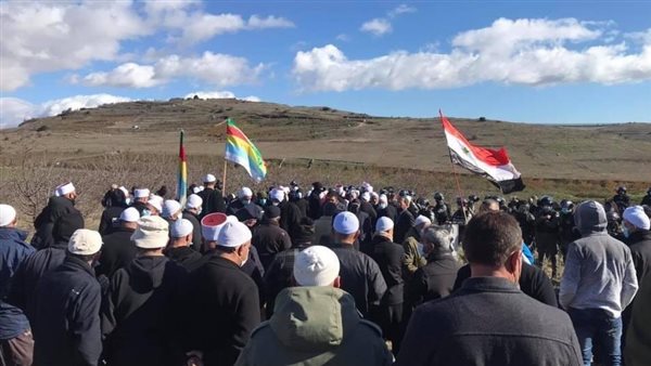 فيما أشارت وسائل إعلام، إلى أن طائرات بدون طيار تعمل على تفريق تظاهرة للدروز مناهضة لإقامة طواحين هواء ضخمة في مرتفعات الجولان، وتلقي عليهم قنابل الصوت والغاز المسيل للدموع.