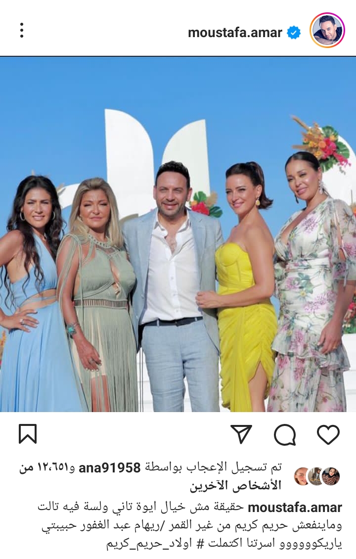 ونشر مصطفى قمر، صورة جمعته بالفنانة بسمة، والفنانة داليا البحيري، والفنانة علا غانم، والفنانة ريهام عبد الغفور، عبر حسابه الشخصي بموقع إنستجرام، وعلق عليها قائلا: حقيقة مش خيال أيوه تاني ولسه فيه تالت، وماينفعش حريم كريم من غير القمر، ريهام عبد الغفور، حبيبتي يا ريكو أسرتنا اكتملت أولاد حريم كريم.
