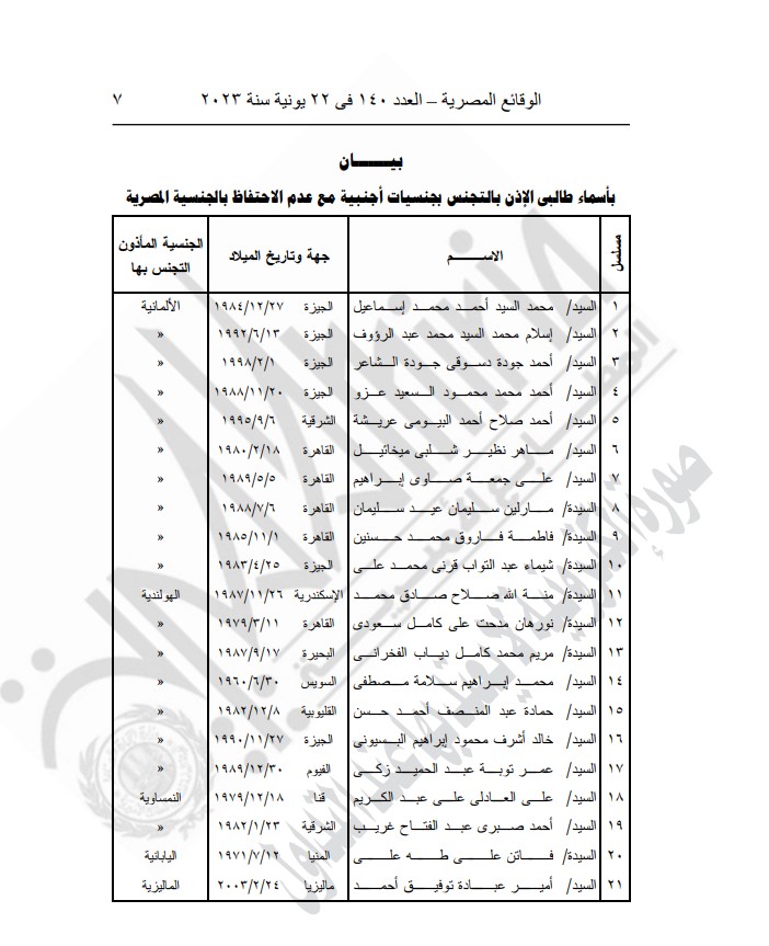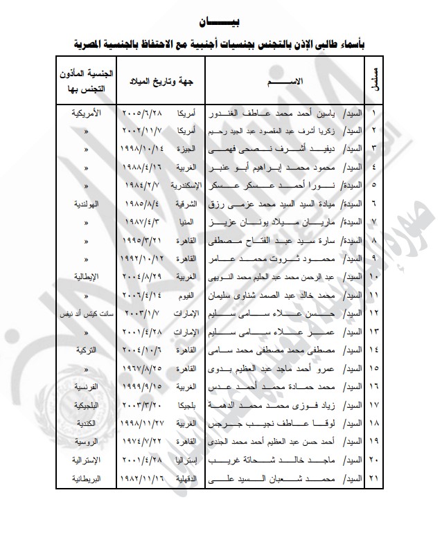 وإليكم أسماء الـ 21 مواطنا المؤذون لهم بالتجنس بالجنسية الأجنبية مع عدم احتفاظهم بالجنسية المصرية