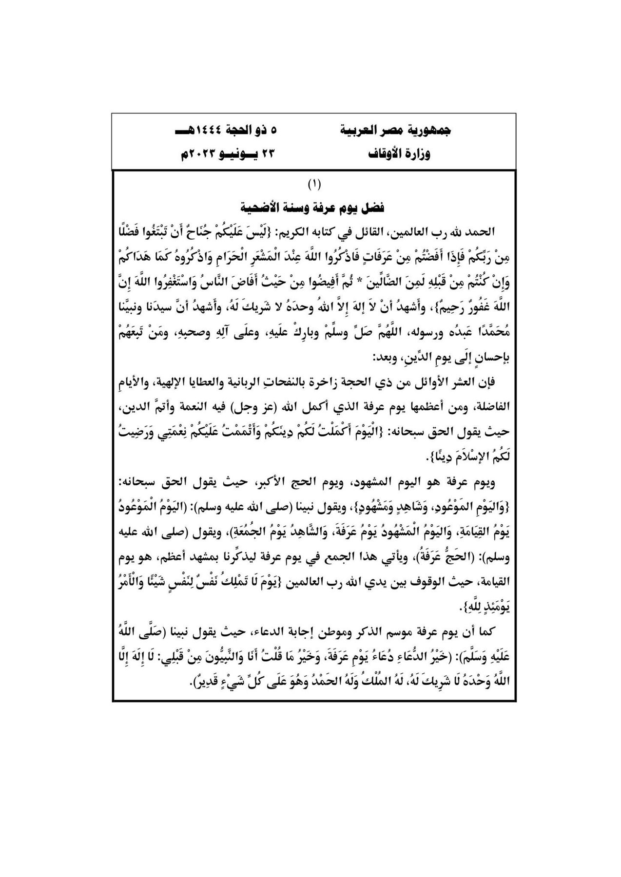 يؤدي أئمة وخطباء المساجد خطبة الجمعة اليوم تحت عنوان، فضل يوم عرفة وسنة الأضحية، والذي حددته وزارة الأوقاف.