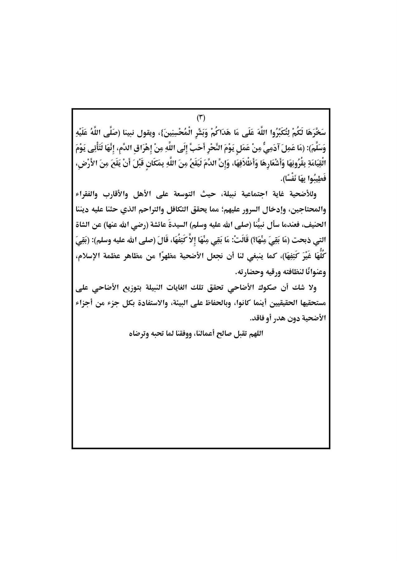 وتابعت: ومن أهم أعمال الخير التي يتأكد فعلها في عشر ذي الحجة التقرب إلى الله عز وجل بذبح الأضحية التي سنها لنا نبينا صلى الله عليه وسلم) إحياء لسنة أبينا إبراهيم | (عليه السلام)، وتحقيقا للتقوى في القلوب، حيث يقول الحق سبحانه: {فَصَلِّ لِرَبِّكَ وَانْحَرْ)، ويقول سبحانه: {لَن يَنَالَ اللَّهَ لُحُومُهَا وَلَا دِمَاؤُهَا وَلَكِنْ يَنَالُهُ التَّقْوَى مِنْكُمْ كَذَلِكَ سَخَّرَهَا لَكُمْ لِتُكَبِّرُوا اللَّهَ عَلَى مَا هَدَاكُمْ وَبَشِّرِ الْمُحْسِنِينَ)، ويقول نبينا (صَلَّى اللَّهُ عَلَيْهِ وَسَلَّمَ): (مَا عَمِلَ آدَمِيٌّ مِنْ عَمَلٍ يَوْمَ النَّحْرِ أَحَبَّ إِلَى اللَّهِ مِنْ إِهْرَاقِ الدَّمِ، إِنَّهَا لَتَأْتِي يَوْمَ الْقِيَامَةِ يَقُرُونِهَا وَأَشْعَارِهَا وَأَخْلافِهَا، وَإِنَّ الدَّمَ لَيَقَعُ مِنَ اللهِ بمكَانِ قَبْلَ أَنْ يَقَعَ مِنَ الْأَرْضِ، فَطِيبُوا بِهَا نَفْسًا، وللأضحية غاية اجتماعية نبيلة حيث التوسعة على الأهل والأقارب والفقراء والمحتاجين، وإدخال السرور عليهم مما يحقق التكافل والتراحم الذي حثنا عليه ديننا الحنيف، فعندما سأل نبينا صلى الله عليه وسلم السيدة عائشة رضي الله عنها) عن الشاة - التي ذبحت (مَا بَقِي مِنْهَا ؟ قَالَتْ مَا بَقِي مِنْهَا إِلا كَتِفُهَا قَالَ (صلى الله عليه وسلم): (بَقِيَ كُلُهَا غَيْرَ كَتِفِهَا)، كما ينبغي لنا أن نجعل الأضحية مظهرا من مظاهر عظمة الإسلام وعنوانا لنظافته ورقيه وحضارته.
