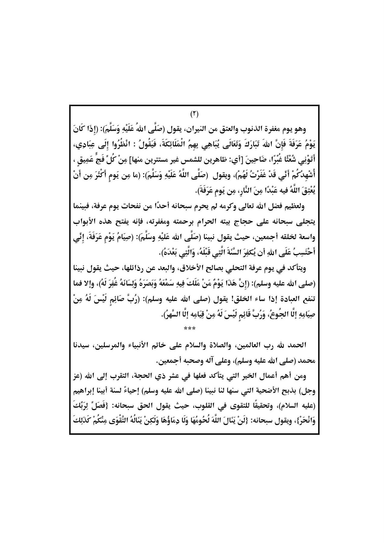 ويوم عرفة هو اليوم المشهود، ويوم الحج الأكبر، حيث يقول الحق سبحانه وَاليَوْمِ المَوْعُود وَشَاهِدٍ وَمَشْهُودٍ، ويقول نبينا صلى الله عليه وسلم): (اليَوْمُ المَوْعُودُ يَوْمُ القِيَامَةِ، وَالْيَوْمُ الْمَشْهُودُ يَوْمُ عَرَفَةَ، وَالشَّاهِدُ يَوْمُ الجُمُعَةِ)، ويقول (صلى الله عليه وسلم): (الحَجِّ عَرَفَةً)، ويأتي هذا الجمع في يوم عرفة ليذكرنا بمشهد أعظم، هو يوم القيامة، حيث الوقوف بين يدي الله رب العالمين {يَوْمَ لَا تَمْلِكُ نَفْسٌ لِنَفْسٍ شَيْئًا وَالْأَمْرُيَوْمَئِذٍ لِلَّهِ.