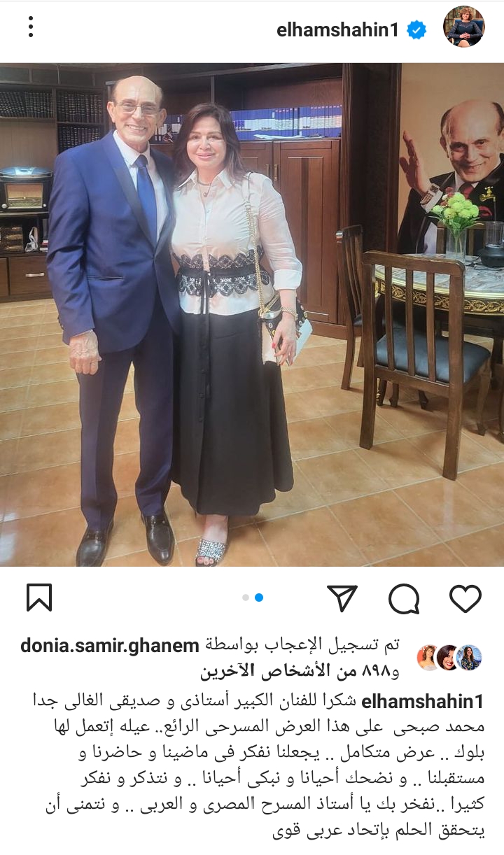 وشاركت إلهام شاهين، متابعيها صورة جمعتها بـ محمد صبحي، عبر حسابها الشخصي بموقع انستجرام، وعلقت عليها قائلة: شكرًا للفنان الكبير أستاذي وصديقي الغالي جدًا محمد صبحي على هذا العرض المسرحي الرائع.