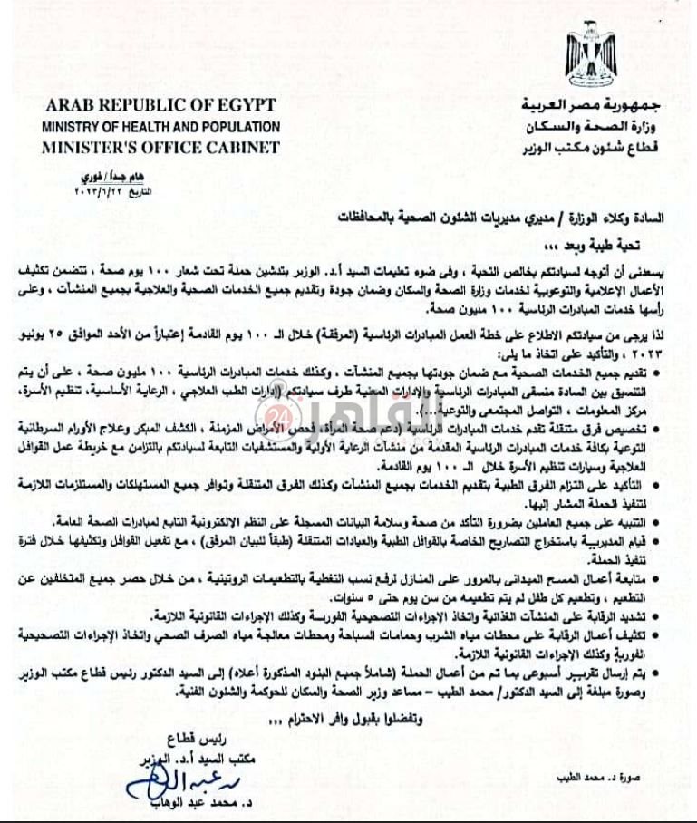 وأوضحت وزارة الصحة والسكان، في خطاب موجه لمديريات الشئون الصحية حصل القاهرة 24 على نسخة منه، أن مبادرة 100 يوم صحة تستهدف تكثيف الأعمال الإعلامية والتوعوية لخدمات وزارة الصحة وتقديم جميع الخدمات الصحية والعلاجية بجميع المنشآت وعلى رأسها خدمات المبادرات الرئاسية 100 مليون صحة.