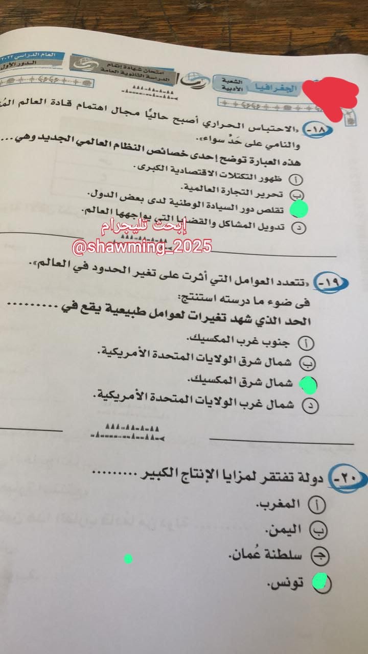 تداولت جروبات الغش باسم شاومينج عبر تطبيق تليجرام، اليوم الأحد، صورا مزعومة لأسئلة امتحان الجغرافيا الذي يؤديه الآن طلاب الثانوية العامة 2023 داخل اللجان الامتحانية.