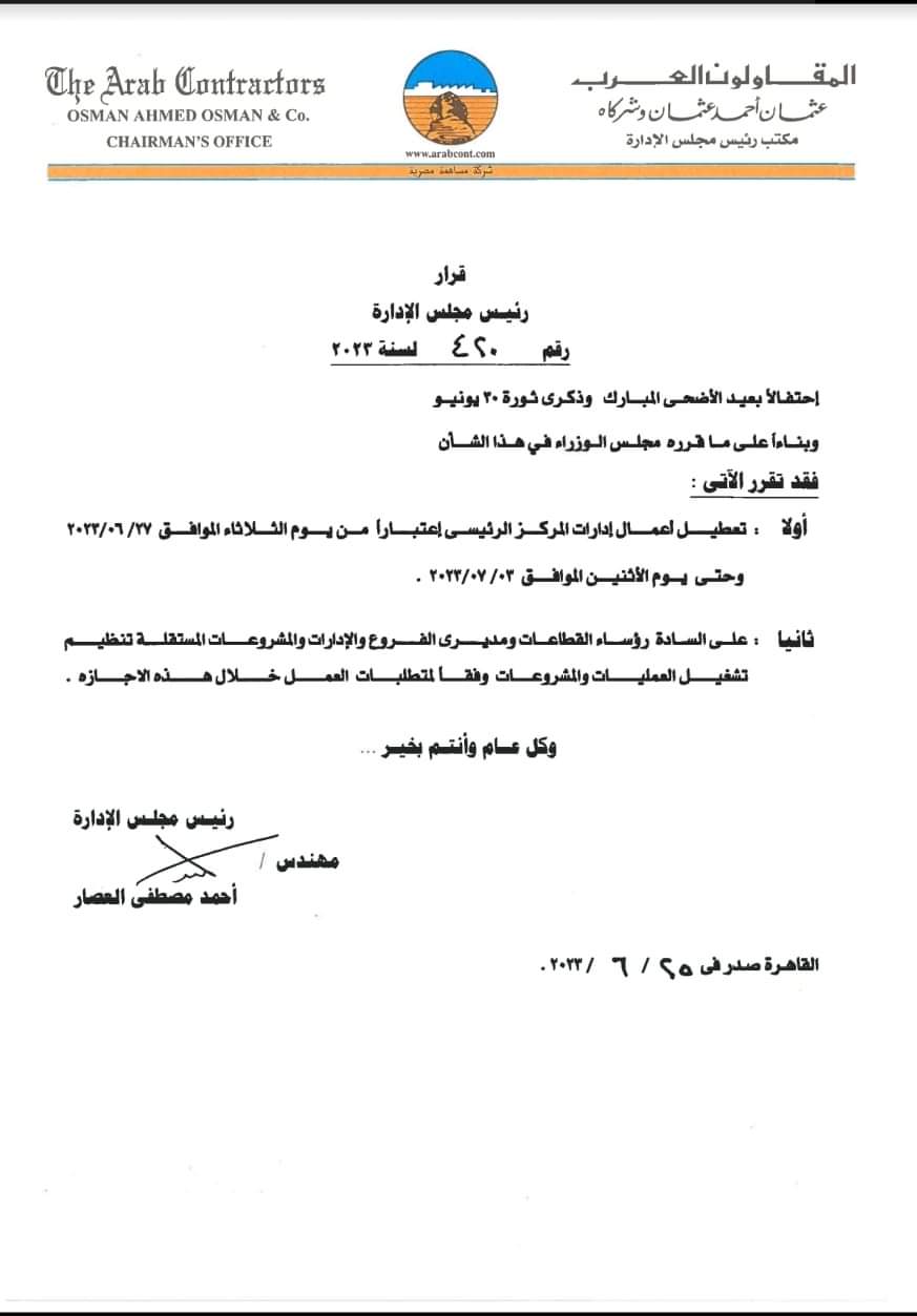 أصدر مجلس إدارة شركة المقاولون العرب قرارا رقم 420 لسنة 2023، بتعطيل أعمال إدارات المركز الرئيسي اعتبارا من يوم الثلاثاء الموافق 27/6/2023 وحتى يوم الإثنين الموافق 3/7/2023 احتفالًا بعيد الأضحى المبارك وذكرى ثورة 30 يونيو.