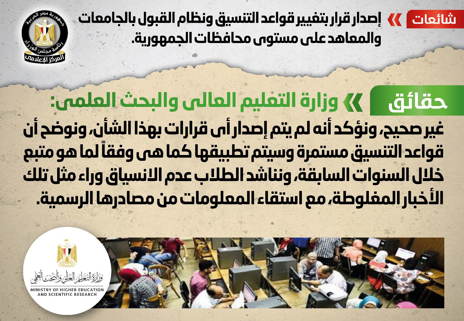 وفي هذا الصدد، تواصل المركز الإعلامي لمجلس الوزراء، مع وزارة التعليم العالي والبحث العلمي، والتي نفت تلك الأنباء، مُؤكدة أنه لا صحة لتغيير قواعد التنسيق ونظام القبول بالجامعات، وأنه لم يتم إصدار أي قرارات بهذا الشأن.