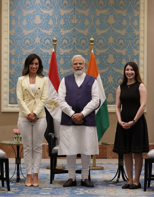 وعن كيفية مقابلة رئيس الوزراء الهندي، أوضحت ندى عادل، أن تم التواصل معهن من خلال السفارة الهندية بالقاهرة، وقابلا السفير الهندي، الذي أخبرهم باللقاء وتحدث معهم أيضا حول رياضة اليوجا.