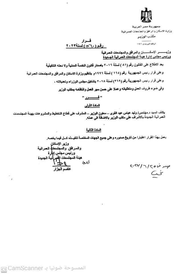 أصدر الدكتور عاصم الجزار وزير الإسكان والمرافق والمجتمعات العمرانية الجديدة قرارًا رقم 560 لسنة 2023، بتكليف المهندس وليد عباس عبد القوي معاون وزير الإسكان والمشرف على قطاع التخطيط والمشروعات بهيئة المجتمعات العمرانية، بالإشراف على مكتب وزير الإسكان بالإضافة إلى عمله.