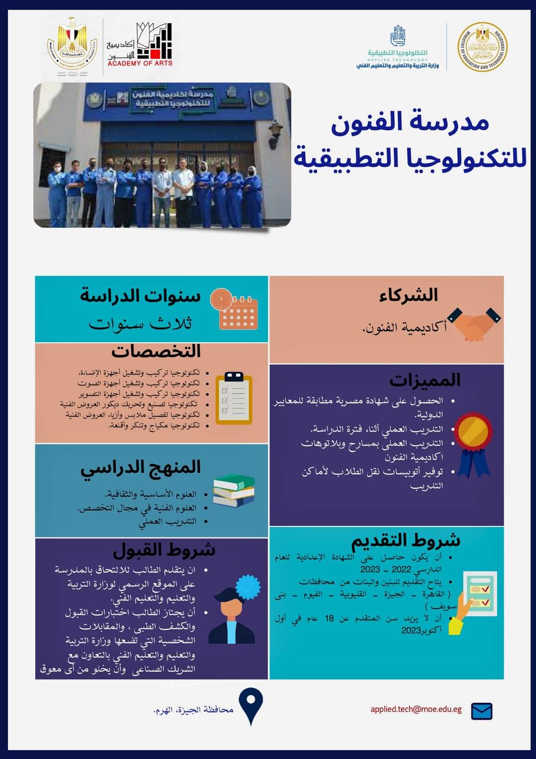 لطلاب الشهادة الإعدادية.. تعرف على شروط القبول في مدرسة الفنون للتكنولوجيا التطبيقية