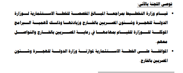 كما أوصت لجنة الخطة والموازنة في البرلمان بالموافقة على الخطة الاستثمارية لموازنة وزارة الدولة للهجرة وشئون المصريين بالخارج.