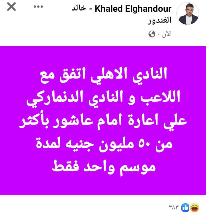 ونشر الغندور على صفحته الشخصية عبر موقع التواصل الاجتماعي فيس بوك: النادي الأهلي اتفق مع اللاعب والنادي الدنماركي على إعارة إمام عاشور بأكثر من 50 مليون جنيه، لمدة موسم واحد فقط.