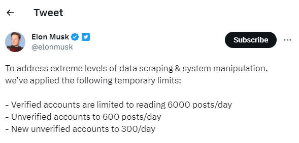 وأوضح إيلوك ماسك من خلال تغريدة له عبر حسابه بتطبيق تويتر، أن فكرة طرح باقات مؤقتة يأتي في محاولة لمعالجة المستويات القصوى من استخراج البيانات ومعالجة النظام، من خلال تحديد معدل قراءة لجميع المشاركات.