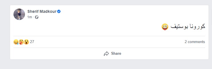 وتابع شريف مدكور في بوست آخر معلنا من خلاله إصابته بفيروس كورونا: كورونا بوستيف.