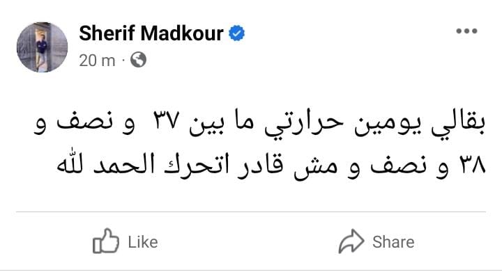 وكتب شريف مدكور، منشورًا عبر حسابه الرسمي بموقع فيسبوك، معلقًا: بقالي يومين حرارتي ما بين 37 ونصف و38 ونصف، ومش قادر أتحرك الحمد لله.