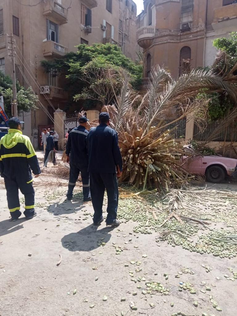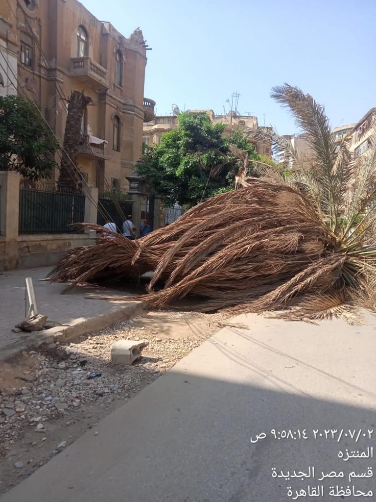 من جانبه، نشق حي مصر الجديدة مع إدارة الحدائق وشركة النظافة والتجميل المسئولة عن جمع ونقل المخلفات والجهات المعنية الأخرى برفع النخلة، وإصلاح الإنارة وإعادة التيار الكهربائي وحل المشكلة.