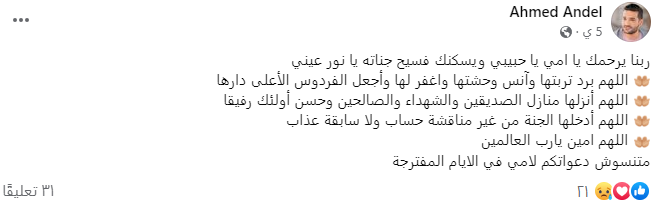 كما كتب أحمد قنديل منشورًَا، آخر قال فيه: إحساس إني اصحي ومكلمش أمي، وتبقي هي أول حد بسمع صوته أول ما بصحى بقى تعبني أوي، ربنا يرحمك يا أمي ويسكنك فسيح جناته يا نور عيني، اللهم أغفر لها، وارفع درجتها في المهديين، وأخلفها في عقبة في الغابرين وأغفر لنا، ولها يا رب العالمين وافسح لها في قبرها ونور لها فيه، اللهم آمين يا رب العالمين.