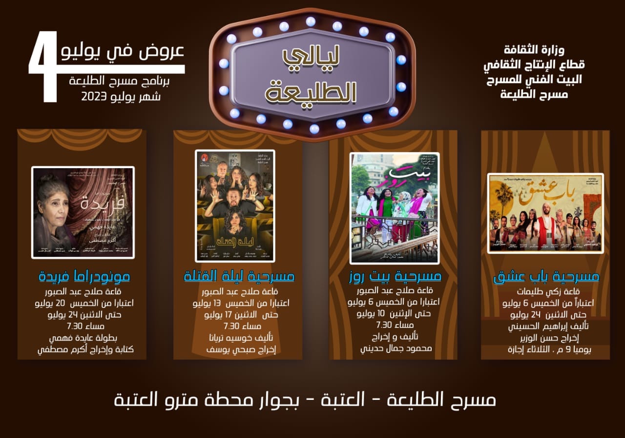 استمرارًا للحراك الفني الذي تشهده مسارح الدولة، يقدم البيت الفني للمسرح برئاسة المخرج خالد جلال، رئيس قطاع شئون الإنتاج الثقافي، والقائم بأعمال رئيس البيت الفني للمسرح، من خلال فرقة مسرح الطليعة، برئاسة المخرج عادل حسان، بعرض 4 مسرحيات خلال شهر يوليو الجاري، على خشبة مسرح الطليعة بالعتبة.