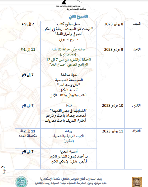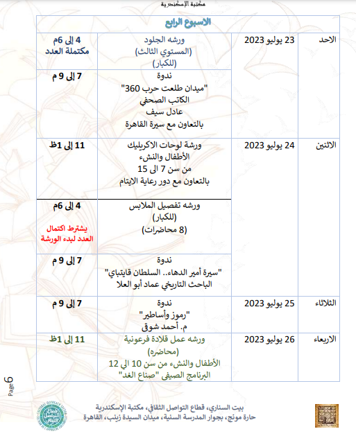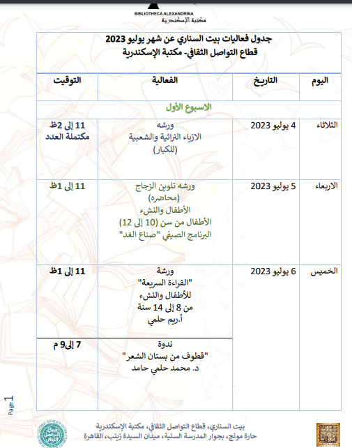 يقيم بيت السناري بالسيدة زينب، التابع لقطاع التواصل الثقافي بمكتبة الإسكندرية، العديد من الفعاليات المتنوعة على مدار شهر يوليو الجاري.