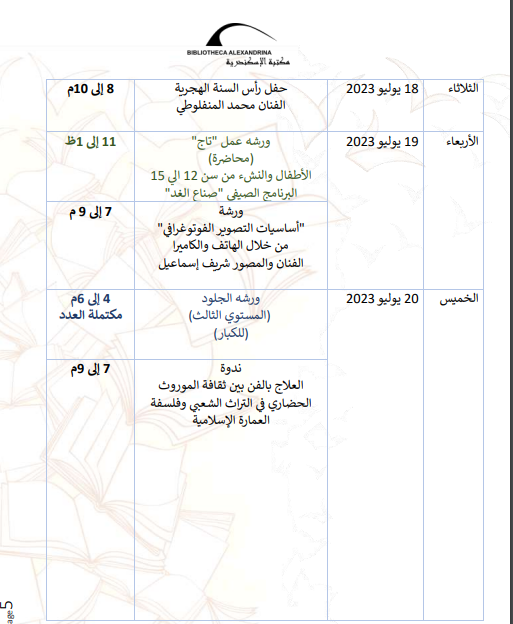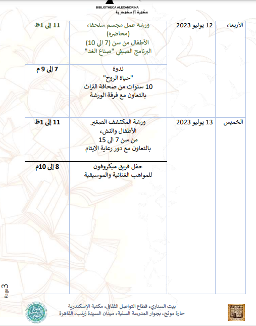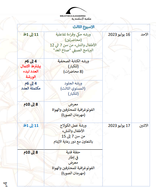 ويوم الأربعاء 12 يوليو تنعقد ورشة بعنوان حياة الروح 10 سنوات من صحافة التراث، فيما تنعقد يوم الأحد 16 يوليو ورشة الكتابة الصحفية. ويوم الأربعاء 19 يوليو تنعقد ورشة أساسات التصوير الفوتوغرافي من خلال الهاتف والكاميرا.