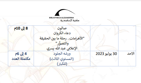 ويوم الأحد الموافق 30 يوليو ينعقد صالون دعاء الكروان تحت عنوان الأهرامات.. رحلة ما بني الحقيقة والتصور للإعلامي يسي عبد الله.
