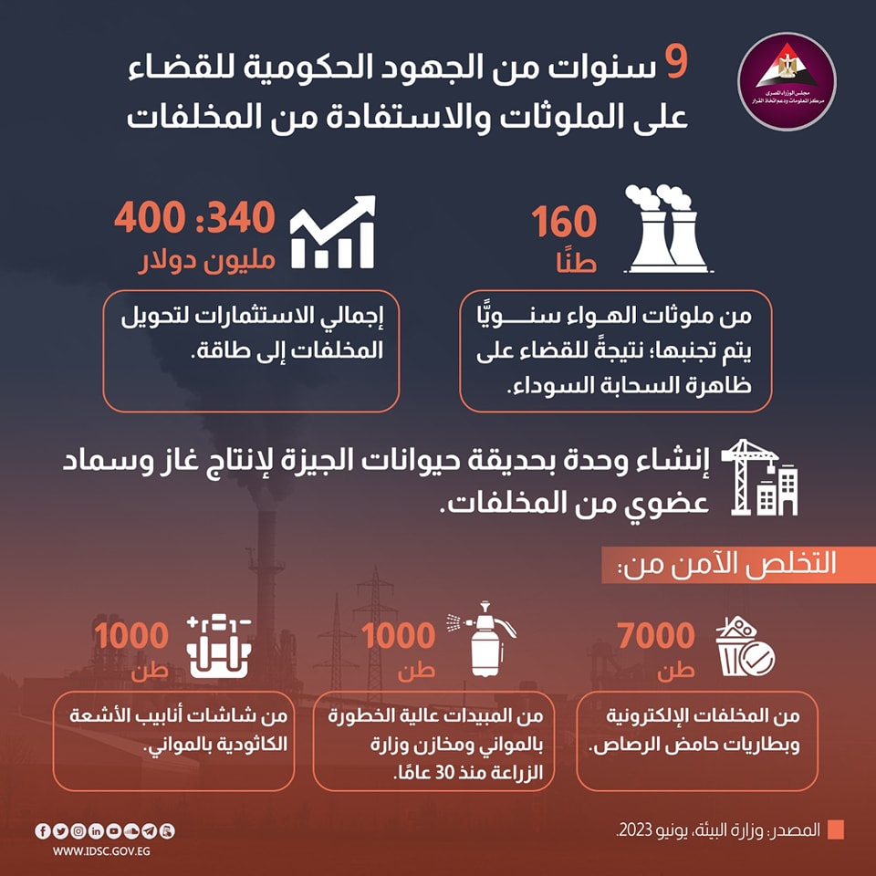 نشر مركز المعلومات ودعم اتخاذ القرار بمجلس الوزراء، انفوجراف سلط خلاله الضوء على الجهود الحكومية للقضاء على الملوثات والاستفادة من المخلفات.