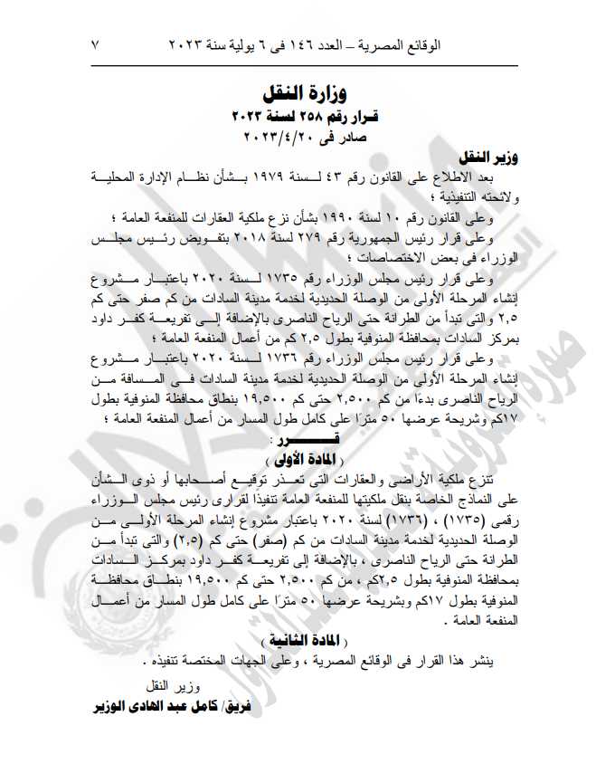 جاء قرار الفريق مهندس كامل الوزير وزير النقل، بعد الاطلاع على القانون رقم 43 لـسنة 1979 بـشأن نظـام الإدارة المحليـة ولائحته التنفيذية؛ وعلى القانون رقم 10 لسنة 1990 بشأن نزع ملكية العقارات للمنفعة العامة ؛ وعلى قرار رئيس الجمهورية رقم 279 لسنة 2018 بتفـويض رئـيس مجلـس الوزراء في بعض الاختصاصات، وعلى قرار رئيس مجلس الوزراء رقم 1735 لـسنة 2020 باعتبـار مـشروع إنشاء المرحلة الأولى من الوصلة الحديدية لخدمة مدينة السادات من كم صفر حتى كم 2.5 والتي تبدأ من الطرانة حتى الرياح الناصري، بالإضافة إلـى تفريعـة كفـر داود بمركز السادات بمحافظة المنوفية بطول 2.5 كم من أعمال المنفعة العامة.