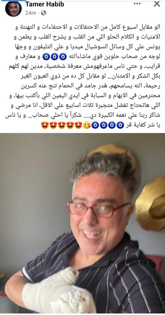 وشارك تامر حبيب، متابعيه بصورة له، عبر حسابه الشخصي بموقع التواصل الاجتماعي فيسبوك، وعلق عليها قائلا: مقابل أسبوع كامل من الاحتفالات والاحتفالات والتهنئة والأمنيات والكلام الحلو اللي من القلب، ويطمن على كل وسائل السوشيال ميديا وعلى التليفون ووجهًا لوجه من صحاب حلوين أوي ما شاء الله، ومعارف وقرايب، وحتى ناس ماعرفهومش معرفة شخصية.. مدين لهم كلهم بكل الشكر والامتنان، لو مقابل كل ده من ذوي العيون الغير رحيمة، الله يسامحهم.
