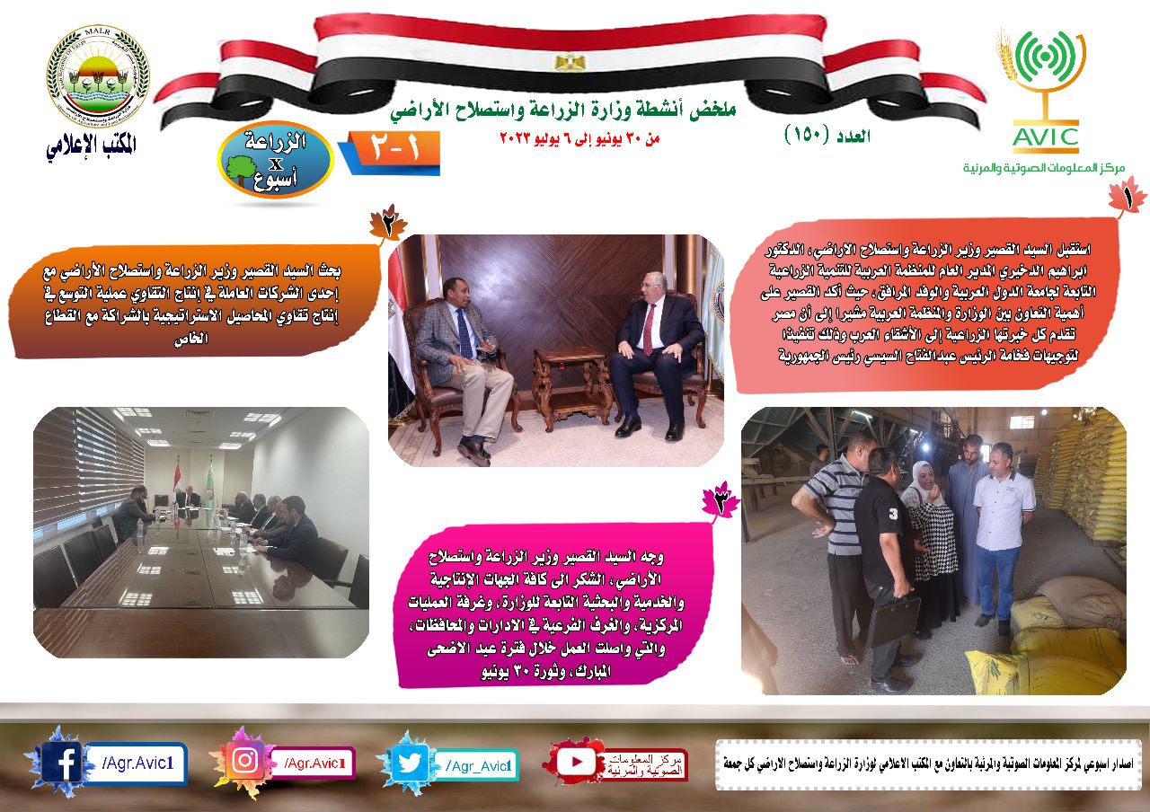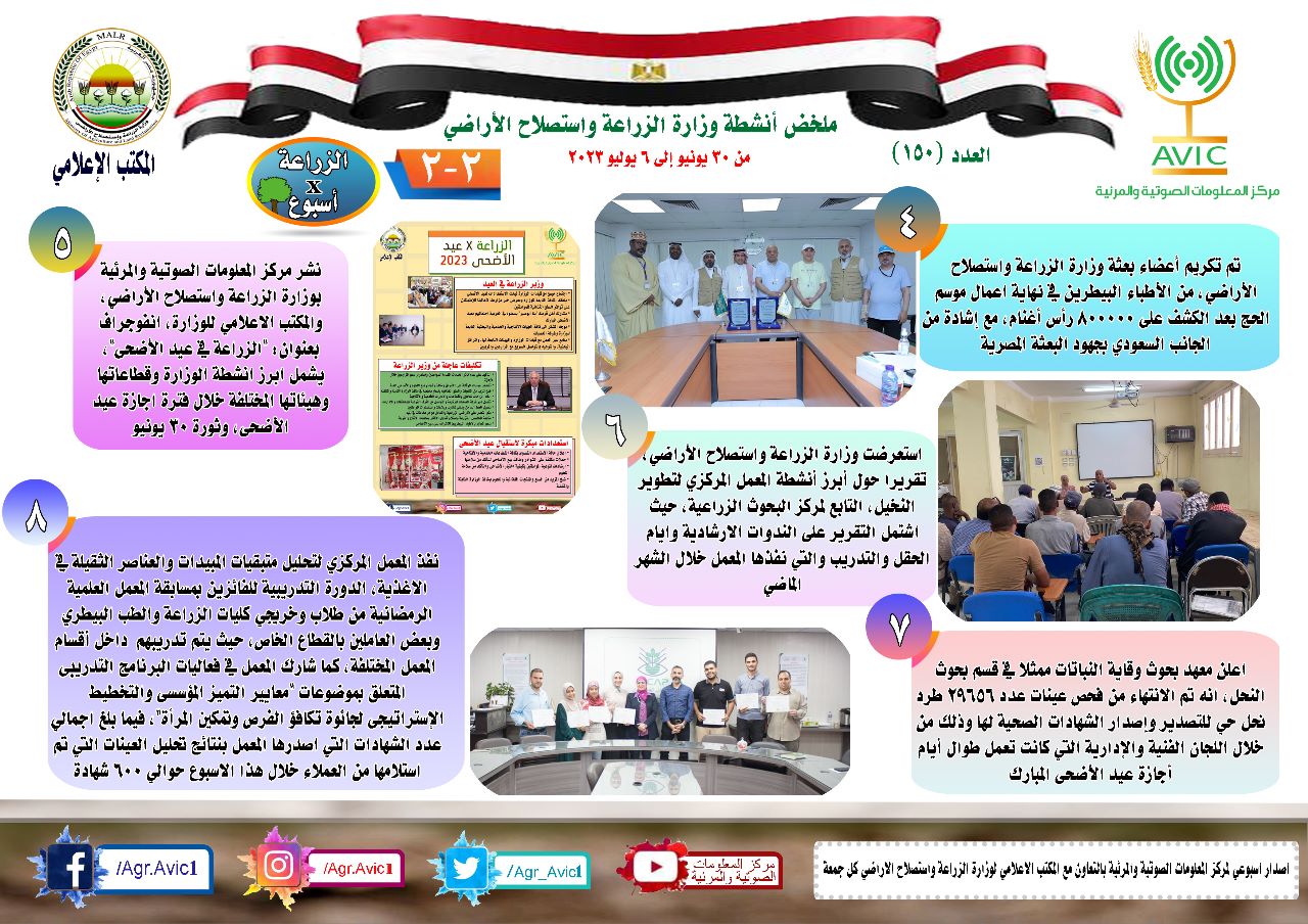 أصدر مركز المعلومات الصوتية والمرئية، التابع لوزارة الزراعة واستصلاح الأراضي، الانفوجراف الأسبوعي في نسخته رقم 150، حول الحصاد الأسبوعي لأهم أنشطة الوزارة، خلال الأسبوع الماضي في الفترة من 30 يونيو وحتى 6 يوليو الجاري، وذلك بالتعاون مع المكتب الإعلامي للوزارة.