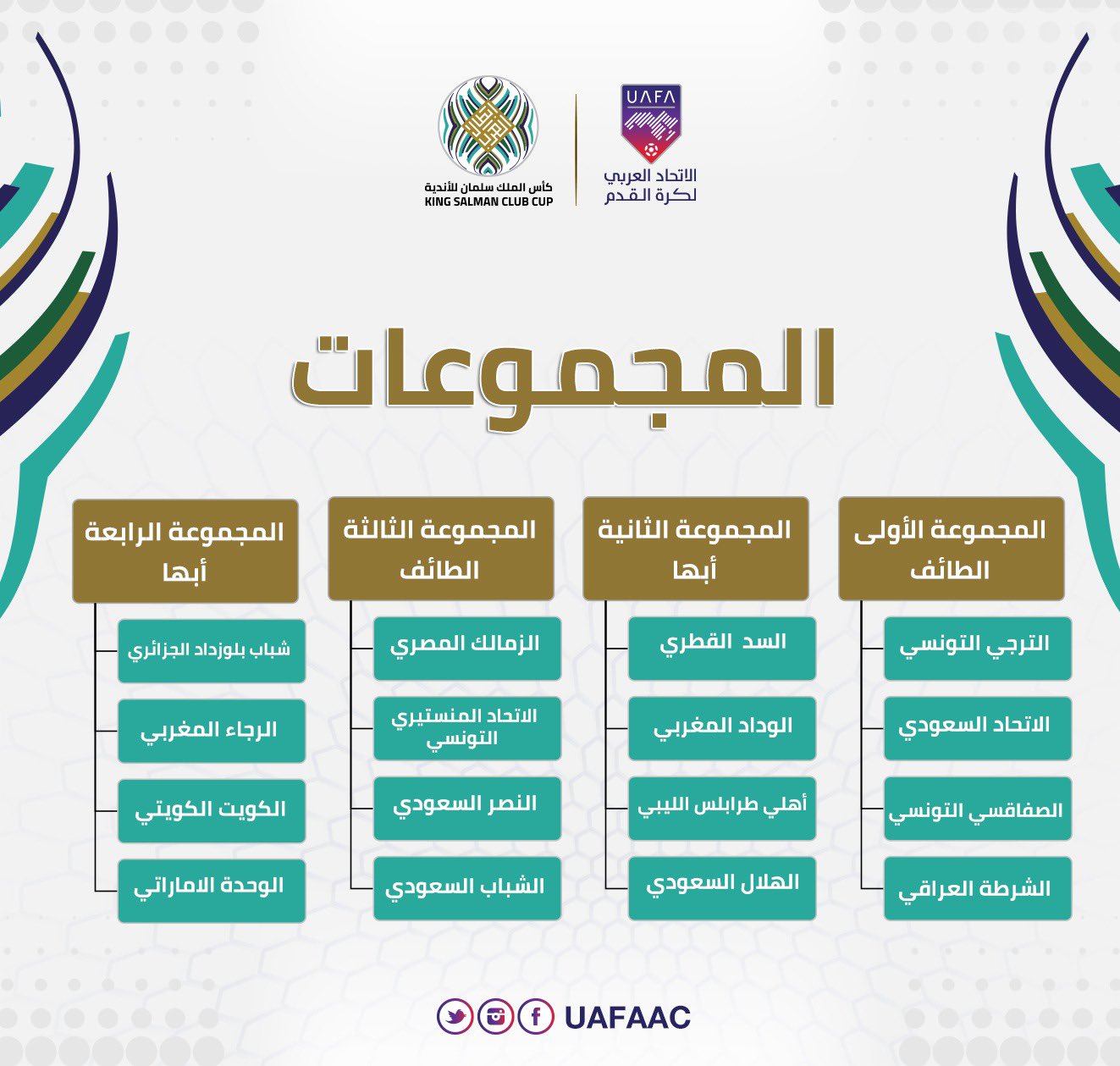 المجموعة الأولى: الترجي التونسي، الاتحاد السعودي، الصفاقسي التونسي، الشرطة العراقي.
