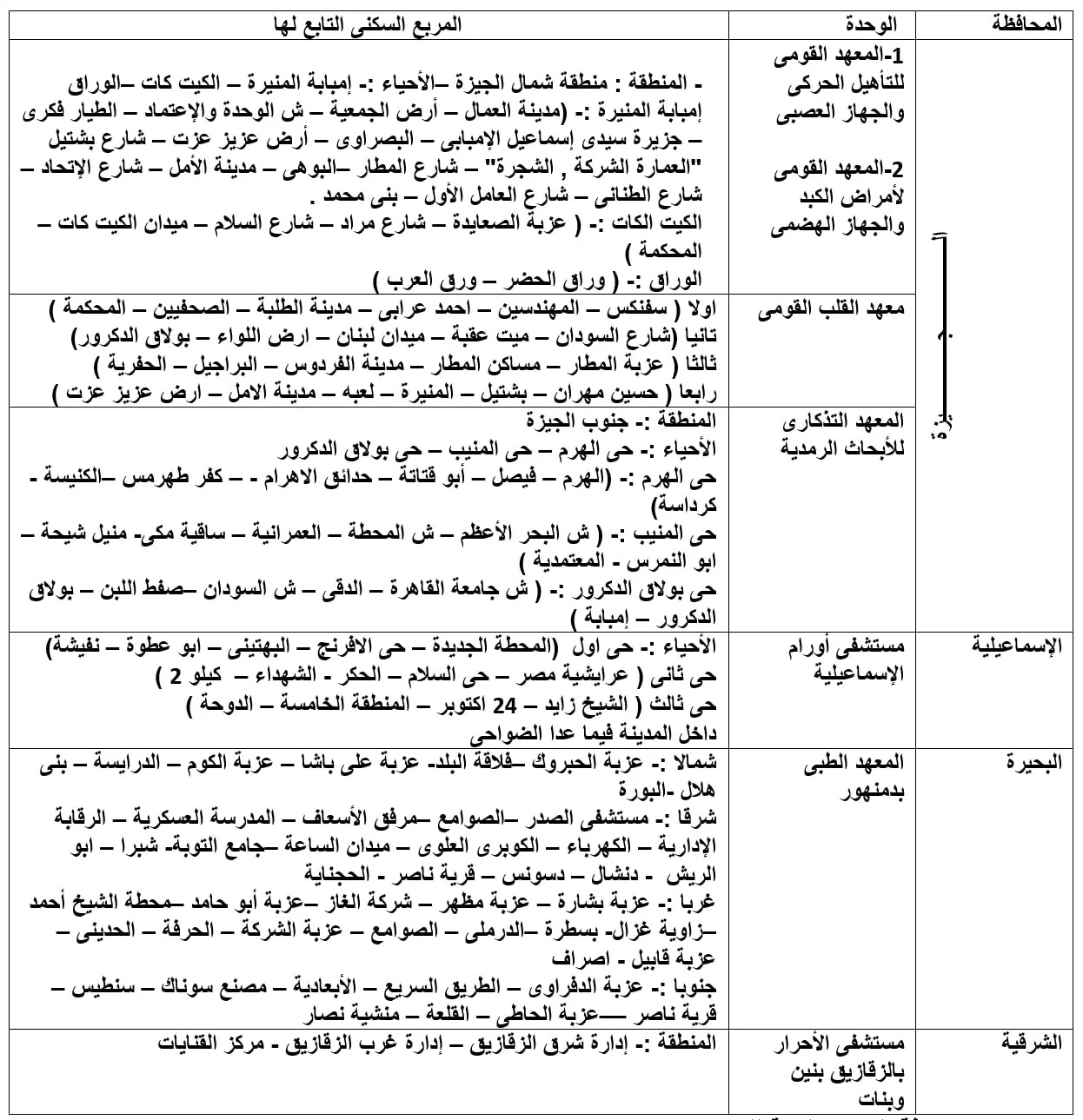 نشرت الهيئة العامة للمستشفيات والمعاهد التعليمية قائمة بالمستشفيات والمعاهد في جميع المحافظات، والمربع السكني التابع لها، وجاءت كالتالي: