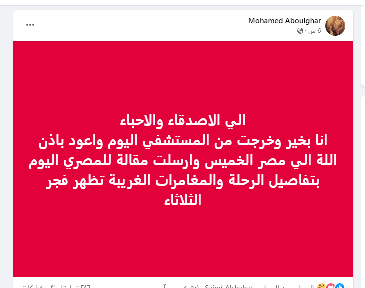 أنا بخير وخرجت من المستشفى اليوم، وأعود بإذن الله إلى مصر الخميس".