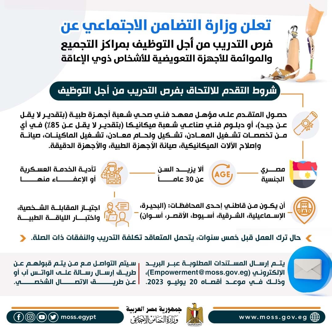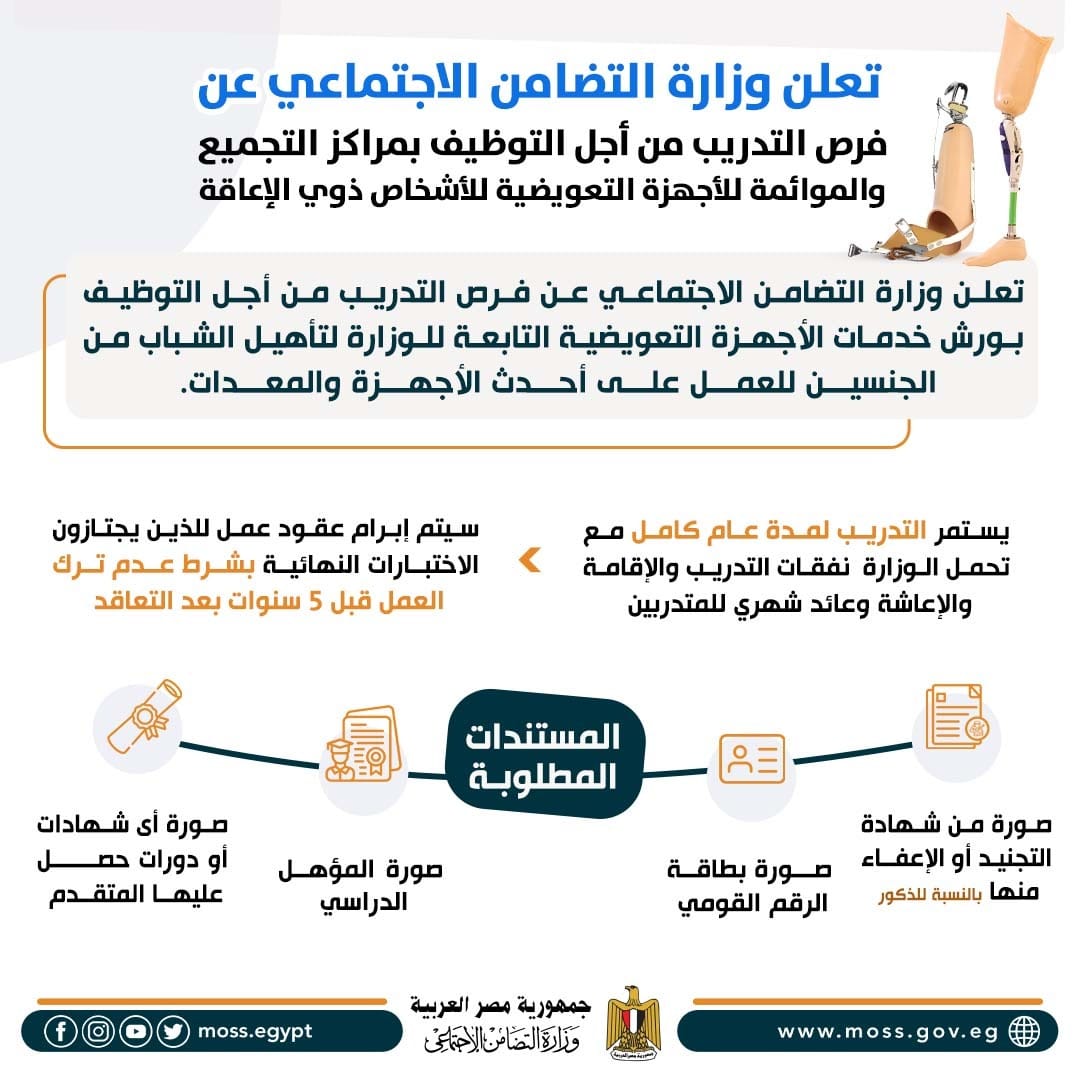 أعلنت وزارة التضامن الاجتماعي توافر فرص التدريب من أجل التوظيف بورش خدمات الأجهزة التعويضية والموائمة للأجهزة التعويضية للأشخاص ذوي الإعاقة التابعة للوزارة لتأهيل الشباب من الجنسين للعمل على أحدث الأجهزة والمعدات، والذي يستمر لمدة عام كامل مع تحمل الوزارة نفقات التدريب والإقامة والإعاشة وعائد شهري للمتدربين.