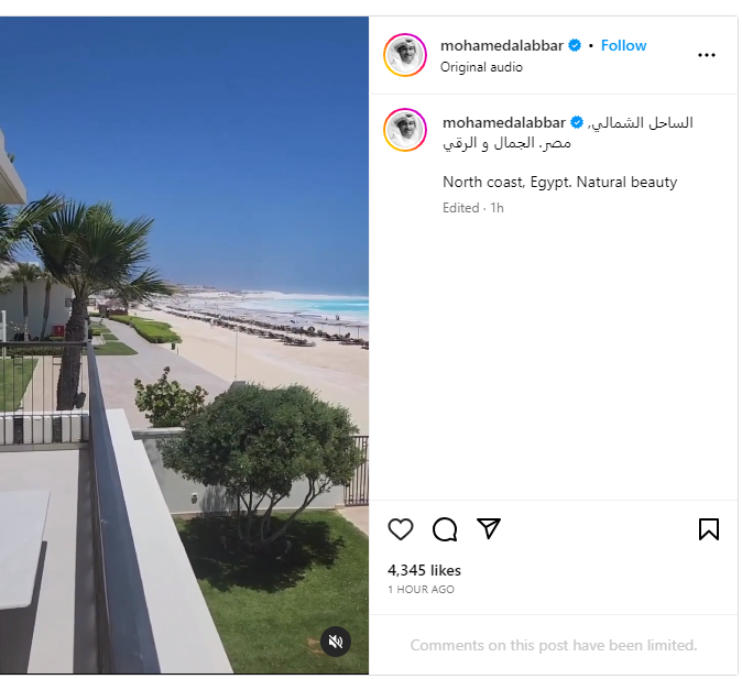 وصل رجل الأعمال الإماراتي البارز محمد العبار إلى مصر حيث نشر مقطع فيديو من الساحل الشمالي، عبر حسابه على موقع إنستجرام.