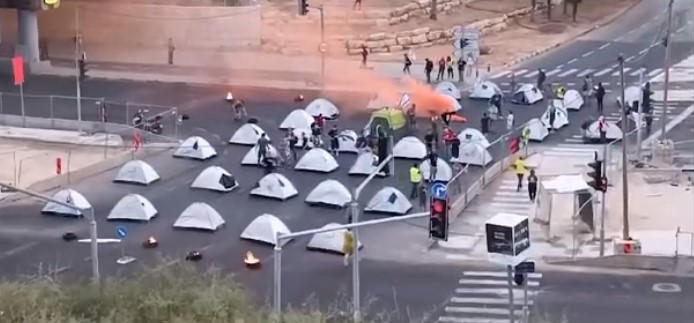 وفي منطقة هرتسليا المحتلة، نصب المتظاهرون الإسرائيليون الخيام وأحرقوا الإطارات، قبل أن تزيلهم الشرطة بالقوة، فيما لم يشر رئيس الوزراء الإسرائيلي بنيامين نتنياهو، حتى الآن، إلى أنه سيوقف التشريع مرة أخرى.