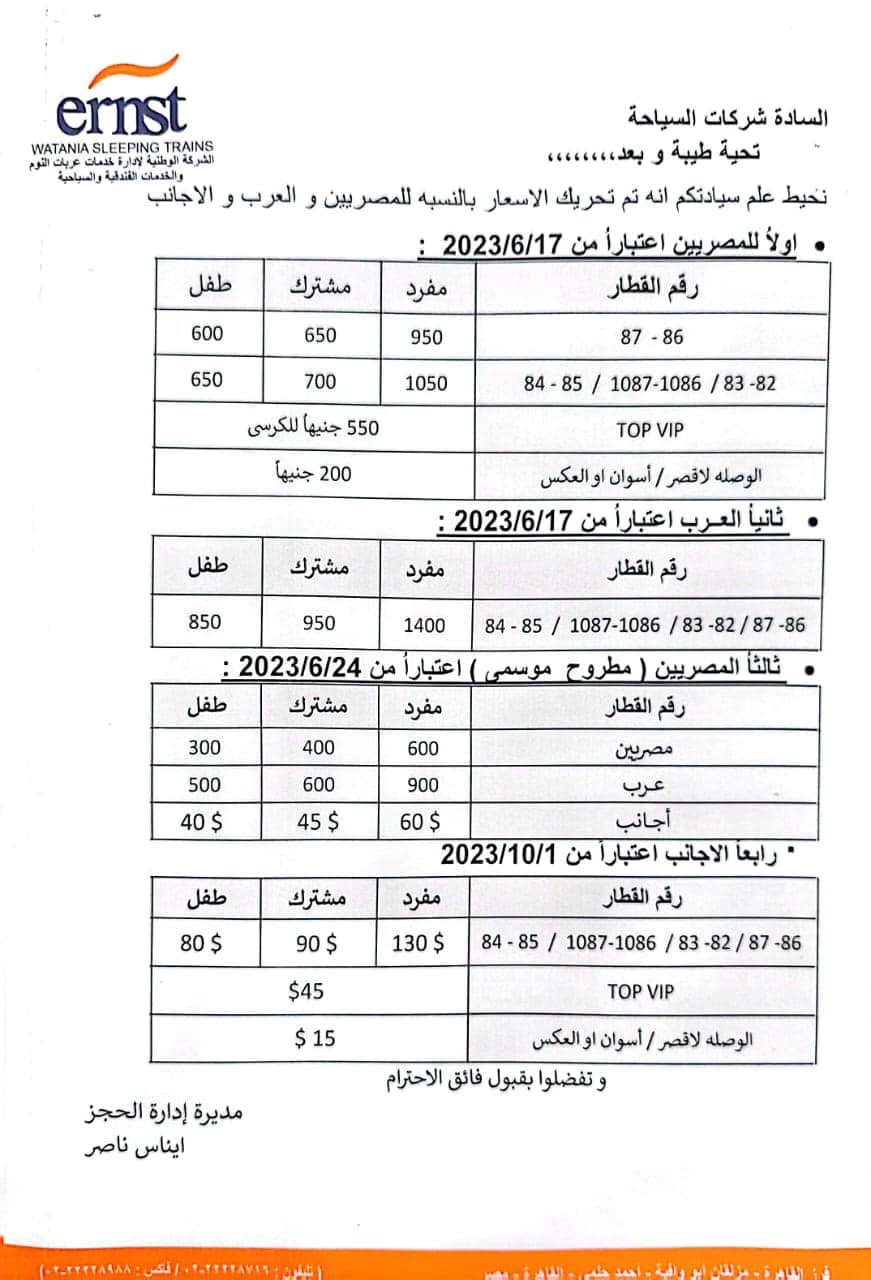 وأعلنت الشركة الوطنية لإدارة وتشغيل قطارات النوم عبر منشور لها على صفحتها الرسمية بـ فيسبوك، أنه سيتم أيضا زيادة أسعار تذاكر قطارات الـ TOP VIP على خط القاهرة - أسوان بالوجه القبلي.