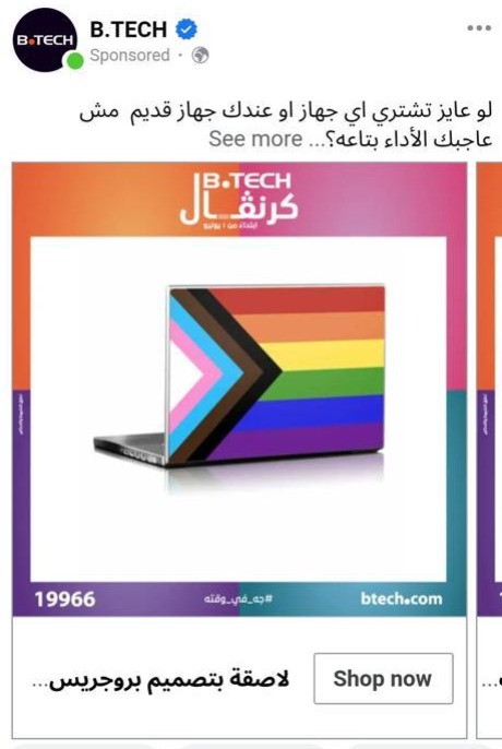الشركة نشرت إعلانا مدفوعا عبر موقع التواصل الاجتماعي فيس بوك لملصق أجهزة لاب توب يحمل شعار المثلية الجنسية، ضمن عروض كرنفال التي بدأتها الشركة منذ 1 يونيو، مما أثار تساؤلات حول رغبة الشركة في الترويج لشعار المثلية الجنسية بهذا الشكل.
