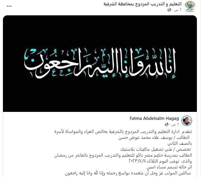 وتقدم المهندس غريب إبراهيم مدير الوحدة الإقليمية للتعليم والتدريب المزدوج بالعاشر من رمضان والعاملين بها بخالص العزاء والمواساة لأسرة، الطالب يوسف علاء محمد عوض حسن.
