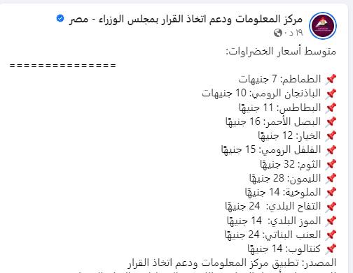 وخلال منشور لـ معلومات الوزراء على صفحته الرسمية على فيسبوك، استعرض المركز أسعار الفاكهة والخضراوات، وجاءت الأسعار كالتالي: