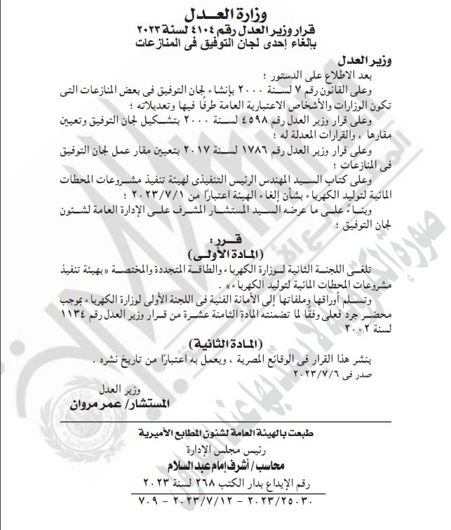 ونشرت الجريدة الرسمية قرار وزير العدل بتشكيل لجان التوفيق وتعيين مقارها، والقرارات المعدلة له: وعلى قرار وزير العدل رقم 1786 لسنة 2017 بتعيين مقار عمل لجان توفيق المنازعات، والاطلاع على كتاب المهندس الرئيس التنفيذي لهيئة تنفيذ مشروعات المحطات المائية لتوليد الكهرباء بشأن إلغاء الهيئة.