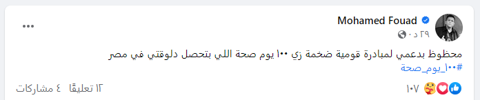 وأعرب الفنان محمد فؤاد، عبر صفحته الرسمية على موقع التواصل الاجتماعي فيس بوك، عن سعادته بدعم تلك المبادرة والمشاركة فيها، حيث كتب: محظوظ بدعمي لمبادرة قومية ضخمة زي 100 يوم صحة اللي بتحصل دلوقتي في مصر.