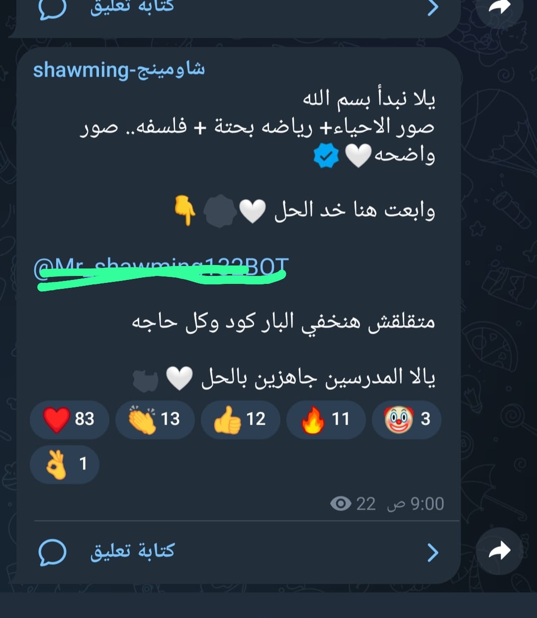 وقال أدمن شاومينج في رسالته التحريضية لطلاب الثانوية العامة للعام الدراسي الحالي 2022-2023: “ صور الأحياء والرياضة البحتة والفلسفة صورًا واضحة متقلقش هتخفي الباركود وكل حاجة المدرسين جاهزين بالحل”.