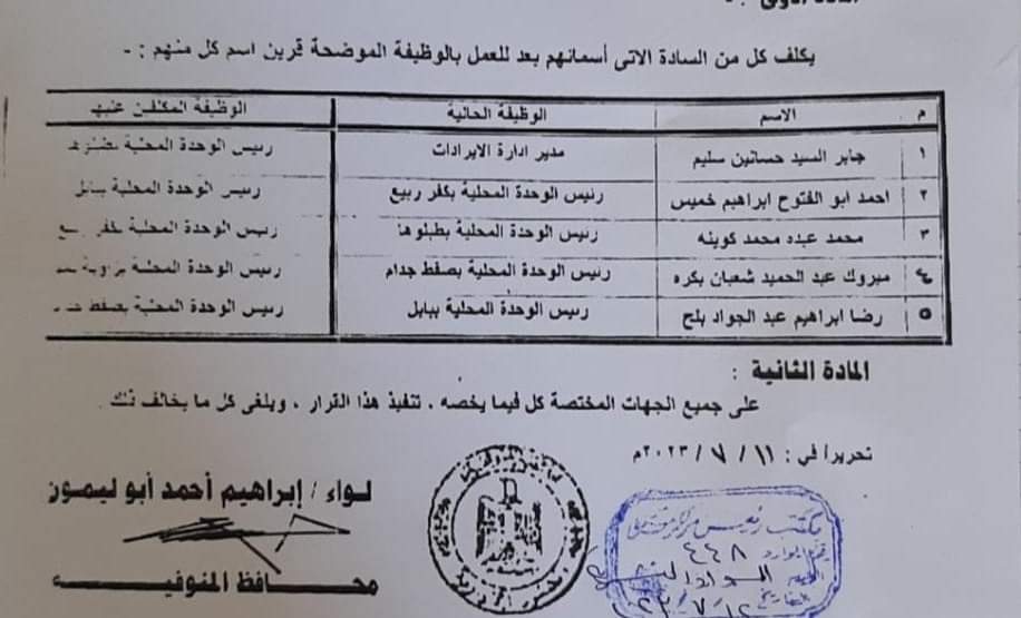 وقرر اللواء إبراهيم أحمد أبو ليمون محافظ المنوفية، من خلال القرار رقم 649 لسنة 2023 تكليف جابر السيد سليم مدير إدارة الإيرادات رئيسا للوحدة المحلية بـ طبلوها، أحمد أبو الفتوح خميس رئيس الوحدة المحلية بكفر ربيع رئيسا للوحدة المحلية ببابل، محمد عبده كوينة رئيس الوحدة المحلية بـ طبلوها رئيسا للوحدة المحلية بكفر ربيع، مبروك عبد الحميد بكرة رئيس الوحدة المحلية بصفط جدام للعمل رئيسا للوحدة المحلية بزاوية بمم، وتكليف رضا إبراهيم عبد الجواد بلح رئيس الوحدة المحلية ببابل للعمل رئيس الوحدة المحلية بصفط جدام.