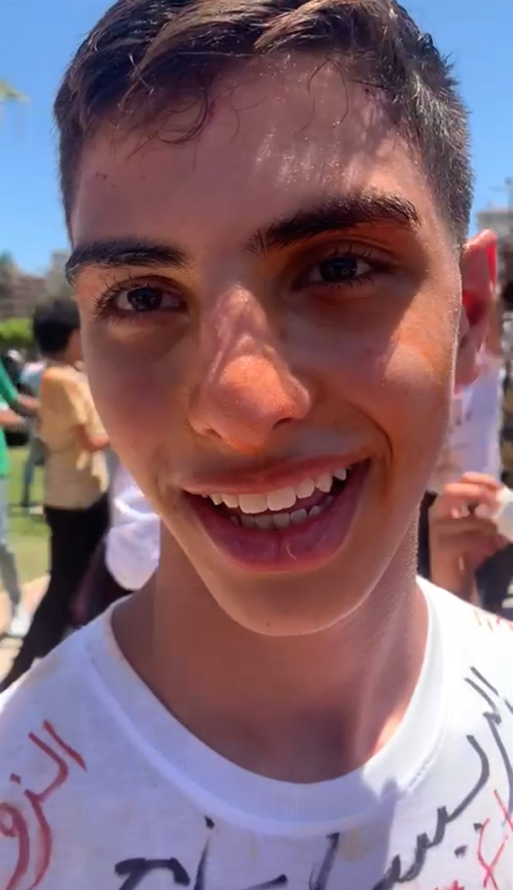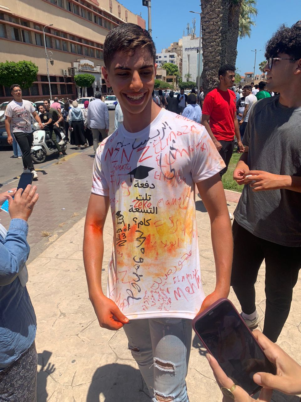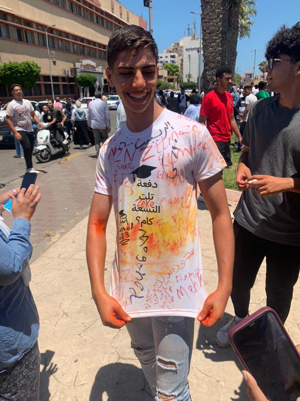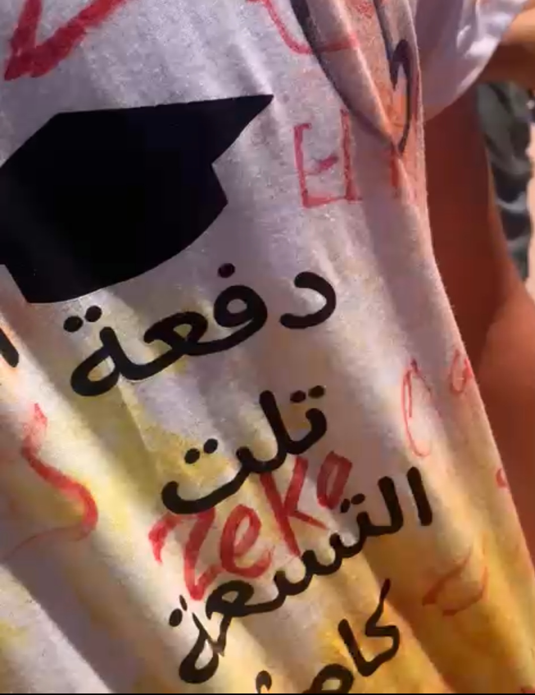 وارتدى الطالب تشيرت مكتوبا عليه: تلت التسعة كام، فيما حرص زملاؤه من الطلاب على التوقيع بأسمائهم على التيشرت.