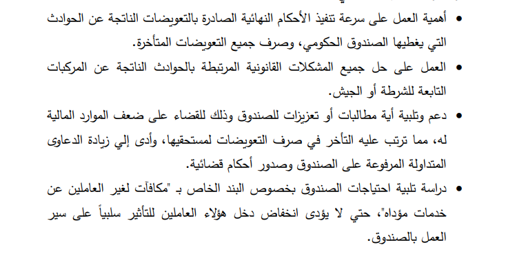 وأوصت الخطة بأهمية العمل على سرعة تنفيذ الأحكام النهائية الصادرة بالتعويضات الناتجة عن الحوادث التي يغطيها الصندوق الحكومي، وصرف جميع التعويضات المتأخرة، بالإضافة لـ العمل على حل جميع المشكلات القانونية المرتبطة بالحوادث الناتجة عن المركبات التابعة للشرطة.