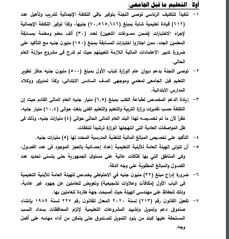 كما أوصت اللجنة أيضًا بدعم ديوان عام الوزارة للباب الأول بمبلغ 500 مليون جنيه حافز تطوير التعليم قبل الجامعي لمعلمي وموجهي الصف السادس الابتدائى، وكذا لمديري ووكلاء المدارس الابتدائية، مع التأكيد على تخصيص المبالغ المالية للتغذية المدرسية المحدد لها 5 مليارات جنيه.