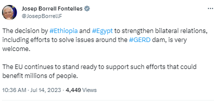 وقال بوريل عبر حسابه الرسمي على تويتر، إن قرار إثيوبيا ومصر لتعزيز العلاقات الثنائية، بما في ذلك الجهود المبذولة لحل القضايا المتعلقة بسد النهضة موضع ترحيب كبير.