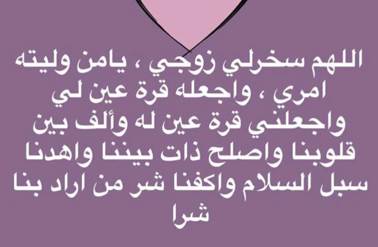 - اللهم يا مسخر الرياح لسليمان ويا مسخر الحوت ليونس ويا مسخر النار لنبينا إبراهيم ويا مسخر جبريل لسيدنا محمد اسألك أن تسخر لي زوجي وأن تكفيه شر الناس واجعله قرة عيني.