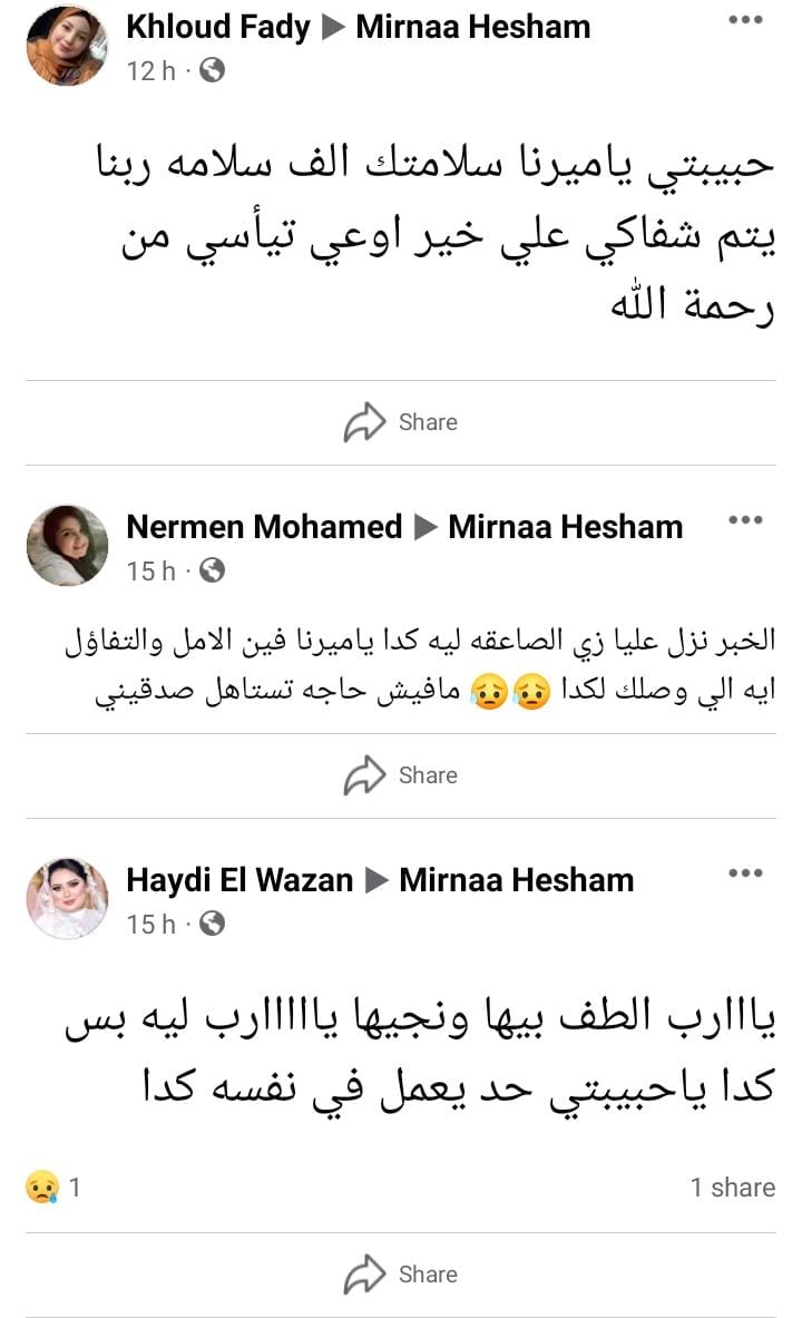 وجاءت منشورات الأصدقاء على حساب ميرنا هشام، بموقع فيسبوك، على النحو الآتي: الخبر نزل عليا زي الصاعقه ليه كدة يا ميرنا فين الأمل والتفاؤل إيه اللي وصلك لـ كده.. مفيش حاجة تستاهل صدقيني.