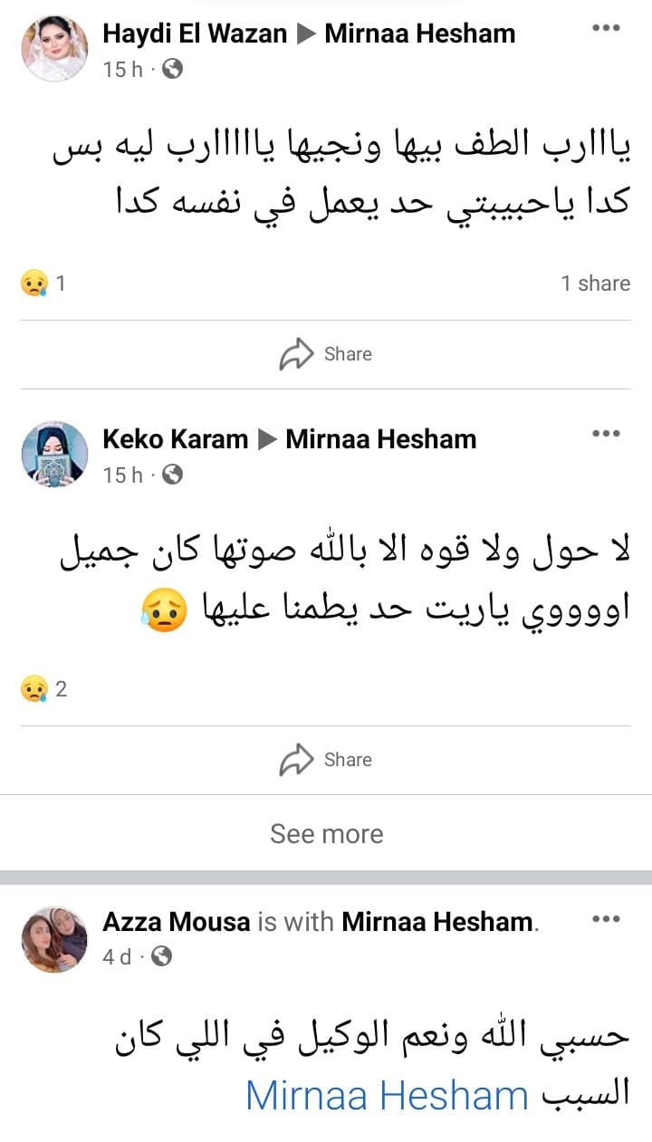 واستمرت التعليقات تنهال على حساب ميرنا هشام، على هذا النحو: يا رب ألطف بيها ونجيها يا رب ليه بس كده ياحبيبتي حد يعمل في نفسه كده، لا حول ولا قوة إلا بالله صوتها كان جميل أوي ياريت حد يطمنا عليها، ومنشور آخر: حسبي الله ونعم الوكيل في اللي كان السبب.